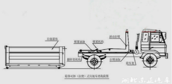 勾臂式垃圾車可將地下垃圾箱內(nèi)的垃圾及垃圾箱一同拉至車上運(yùn)走同時可自卸,降低了工人的勞動強(qiáng)度。該垃圾車的收運(yùn)方式是目前世界上廣泛采用的垃圾收運(yùn)方式,可以實現(xiàn)一車多 箱,大大降低了配備成本和空間等等;其專用裝置的功能均以汽車發(fā)動機(jī)為動力,通過液壓機(jī)構(gòu)手動或電控來實現(xiàn)。車輛的箱體采用優(yōu)質(zhì)炭鋼板全密封焊接結(jié)構(gòu),具有強(qiáng)度高、重 量輕、不產(chǎn)生二次污染等優(yōu)點。