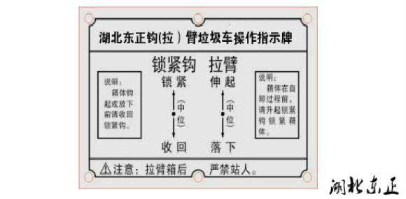 在勾臂式垃圾車裝載垃圾前,空載運(yùn)轉(zhuǎn)達(dá)到 6 個標(biāo)準(zhǔn)氣壓時,掛上取力器(駕駛室內(nèi)方向盤左下方), 檢查各部件有無泄漏或異常后,再按照操作指示牌指示位置進(jìn)行操作; 操作手柄指示牌如圖: