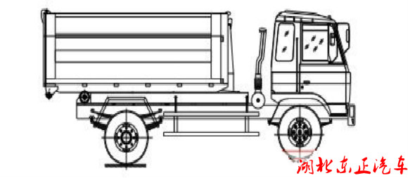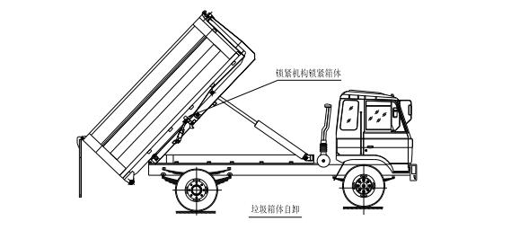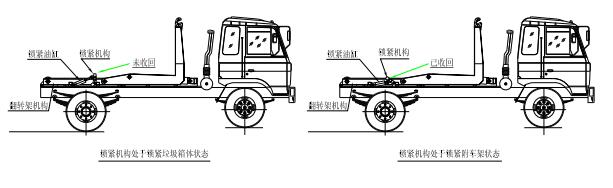 該車是由汽車底盤、拉臂主油缸、附車架、翻轉(zhuǎn)架、支撐腿(選裝)、鎖緊架、鎖緊油缸及多路換向閥等組成。翻轉(zhuǎn)架一端連在附車架上,其另一端設(shè)有活動拉臂,中間安裝有 鎖緊系統(tǒng);活動臂油缸一端連在活動臂上,另一端連接在附車架上;鎖緊機(jī)構(gòu)通過鎖緊油缸的動作可以在箱體自卸時將附車架上的箱體與翻轉(zhuǎn)架及拉臂連為一體,在主油缸伸出時 形成自卸角,也可以通過鎖緊油缸的收回把翻轉(zhuǎn)架與附車架鎖緊為一體,利用主油缸的收回或伸出使活動拉臂將地下的垃圾箱拖拉至附車架上或從附車架上放回到地面。