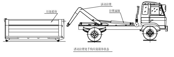 步驟 2.將拉臂操作手柄拉起到伸起位置,拉臂油缸伸出,活動拉臂繞翻轉(zhuǎn)翻轉(zhuǎn)架前鉸鏈軸旋轉(zhuǎn),拉臂處于鉤箱位置,適當(dāng)調(diào)整拉臂鉤高度并與箱體彎鉤對準(zhǔn);如圖: