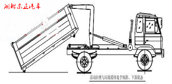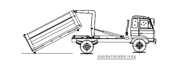 步驟 9. 垃圾箱放置好后,調(diào)整活動拉臂鉤與箱體彎鉤位置,使其脫鉤,將拉臂操作手柄推下到落下位置,拉臂油缸收回,活動拉臂繞翻轉(zhuǎn)翻轉(zhuǎn)架前鉸鏈軸旋轉(zhuǎn),活動拉臂放回到附 車架上,松開取力器垃圾箱放置完成,整車可以運(yùn)輸行駛;